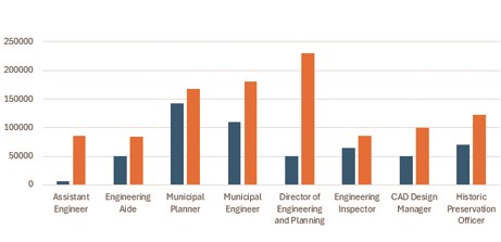 Below are salary ranges gathered from municipal salary ordinances. Each range represents the salary range for a position within one municipality.