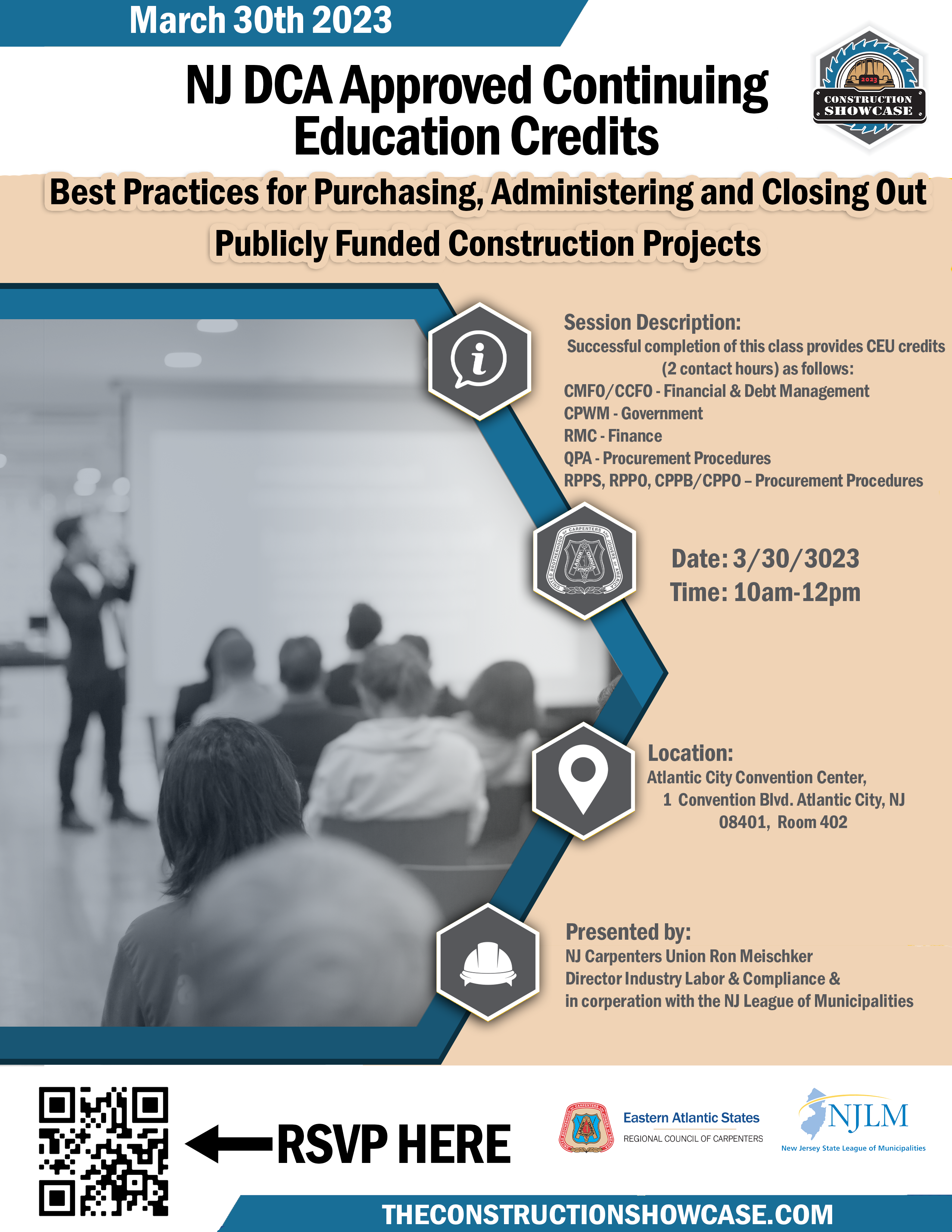 The New Jersey Carpenters Union will be hosting a free seminar on “Best Practices for Purchasing, Administering and Closing Out Publicly Funded construction Projects on March 30 from 10:00 a.m. to 12:00 p.m. at the Atlantic City Convention Center, Room 402, Atlantic City. Advance registration for the seminar, with DCA approved continuing education credits, is required.